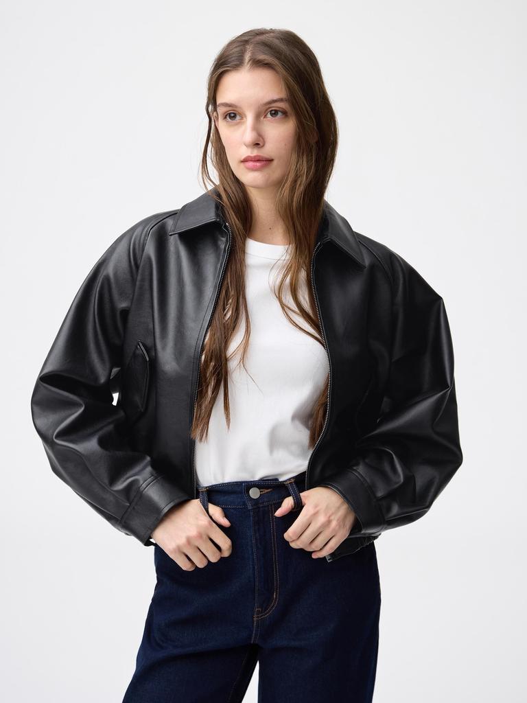 This jacket features a classic blouson base with a rounded design.