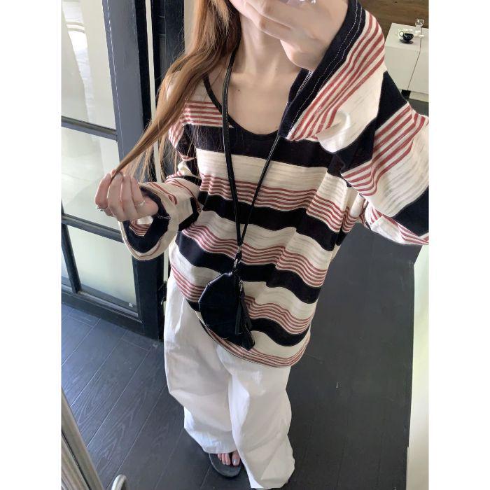 This stylish women's long sleeve T-shirt is designed to offer both fashionable retro appeal and practical sun protection. Crafted from high-quality polyester, it features a loose fit that provides comfort and a slimming effect. The T-shirt showcases a unique striped pattern and comes with a round neckline, adding a touch of classic elegance to any outfit. Perfect for casual wear or layering, this versatile piece combines functionality with a chic aesthetic.