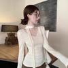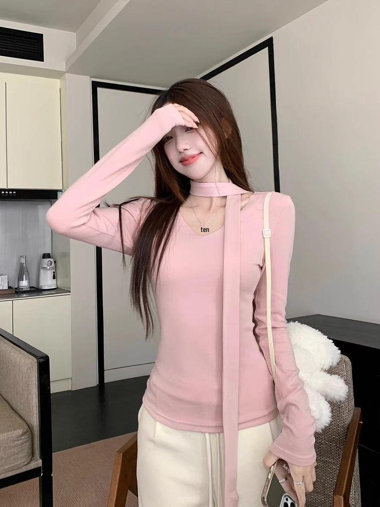 Stay stylish and cozy this autumn and winter with this elegant women's slim fit long-sleeve top. Crafted from luxurious derong material, it promises both comfort and warmth. Featuring a sophisticated solid pattern, the design is adorned with a chic V-neck turtleneck and delicate ribbons, adding a touch of feminine charm to your wardrobe. Perfect for layering or wearing on its own, this top is an essential addition to your seasonal collection.