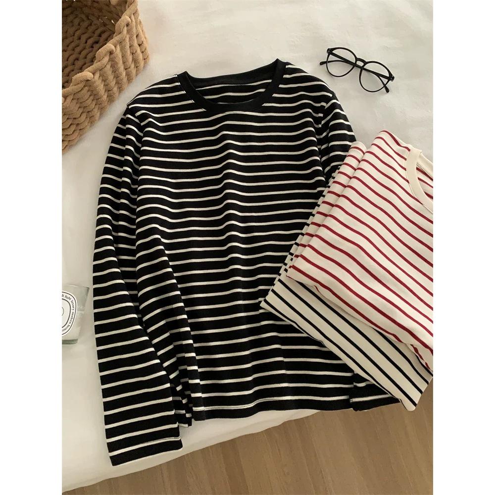 Korean Style Plus Size Striped Round Neck Long Sleeve T-shirt for Women - Autumn Winter Casual Loose Pullover
