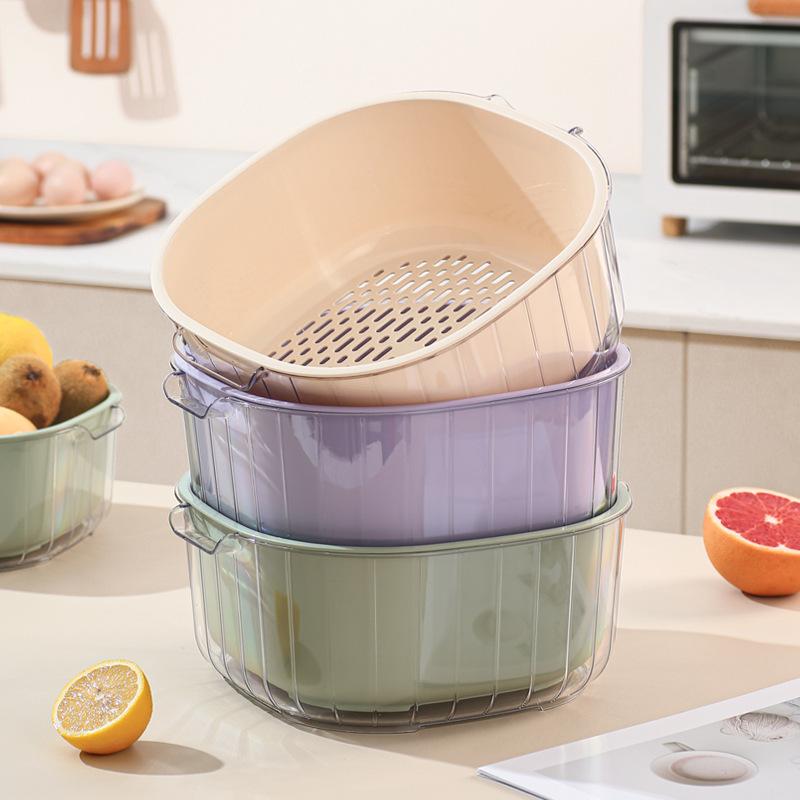 Double Layer Drain Basket Cream Style Food Grade Plastic Fruit Vegetable Washing Basin Space Saving for Household Kitchen
