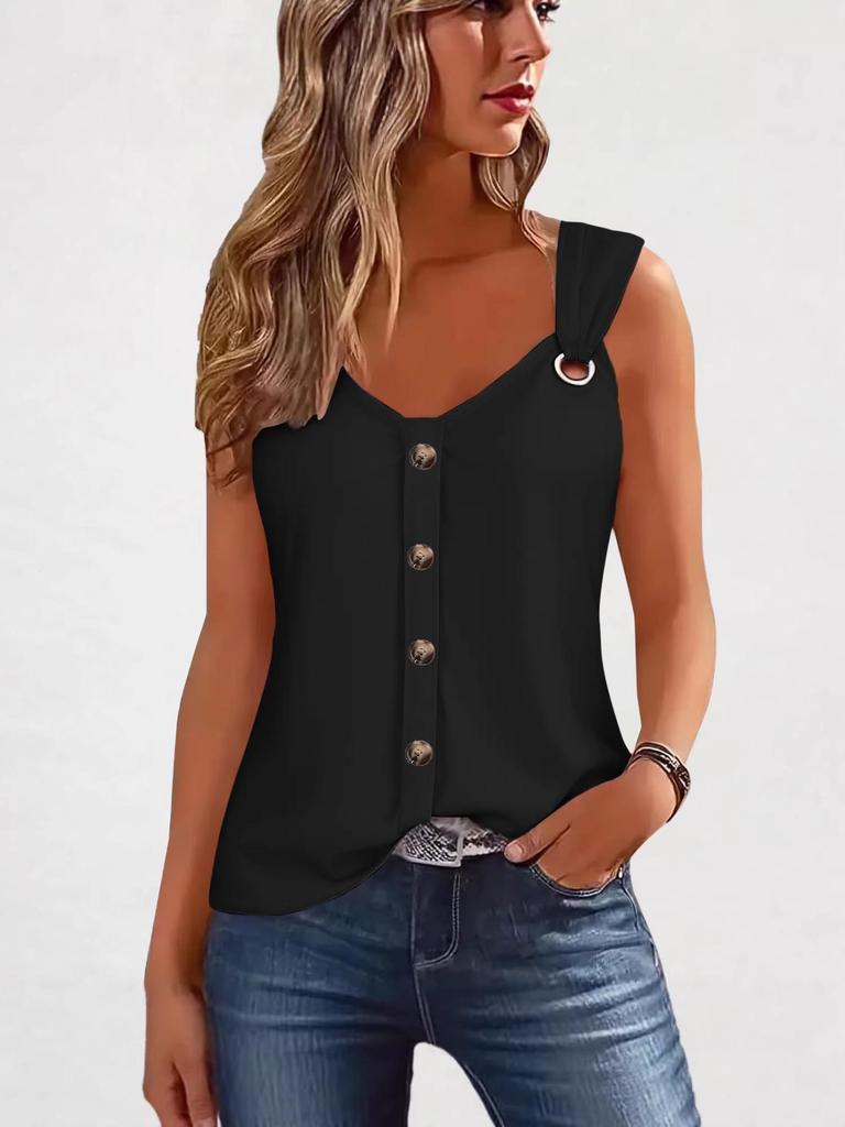 Experience effortless style with this women's sleeveless top, featuring delicate spaghetti straps and elegant button detailing. Crafted from high-quality spandex material, this fashionable vest offers a comfortable stretch and a flattering fit. The v-neckline adds a touch of sophistication, making it a versatile piece perfect for casual outings or layering under jackets.