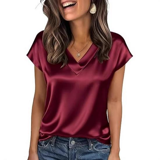 Elevate your wardrobe with this sophisticated satin pullover top, perfect for spring and summer seasons. Crafted from high-quality polyester, its lightweight and smooth material promises comfort and elegance. The solid color design ensures versatility, whether you're dressing for a casual day at work or a business meeting. Featuring a flattering V-neck and long sleeves, this top can be effortlessly paired with your favorite trousers or skirts for a polished and chic look.