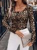 Leopard Print Button-Up Slim-Fit Casual Long-Sleeve Women's T-shirt for Spring & Autumn