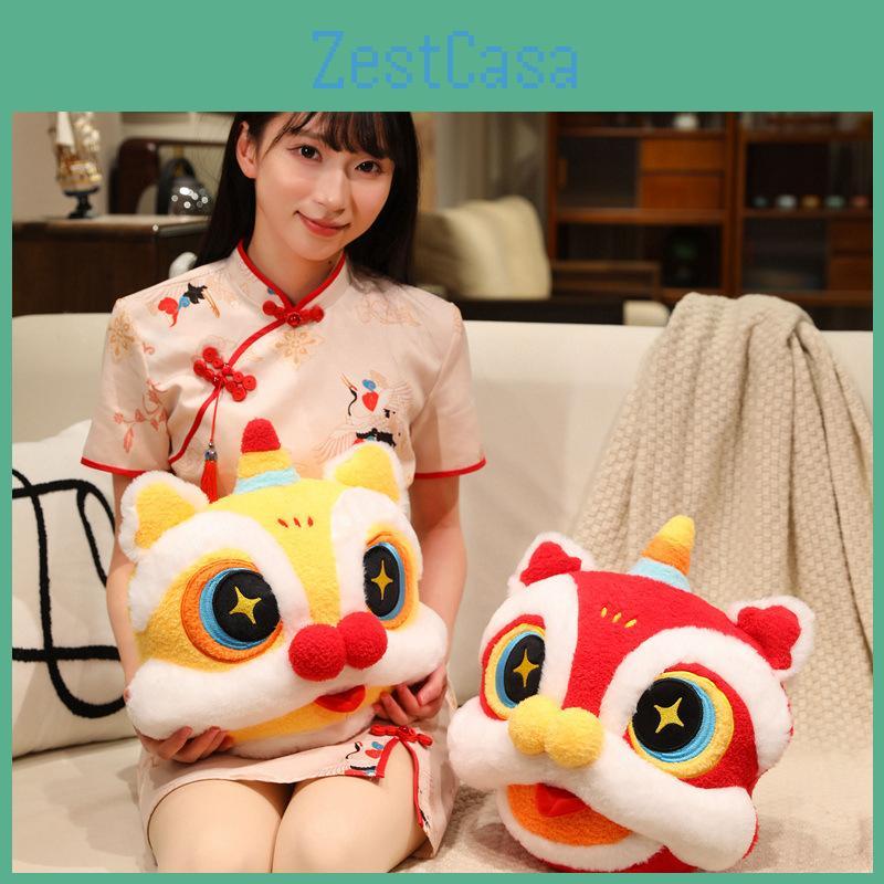 This plush decorative pillow set features detailed designs including a red lion dance figure, koi fish, and auspicious symbols, perfect for enhancing home decor. Made of polar fleece with PP cotton filling