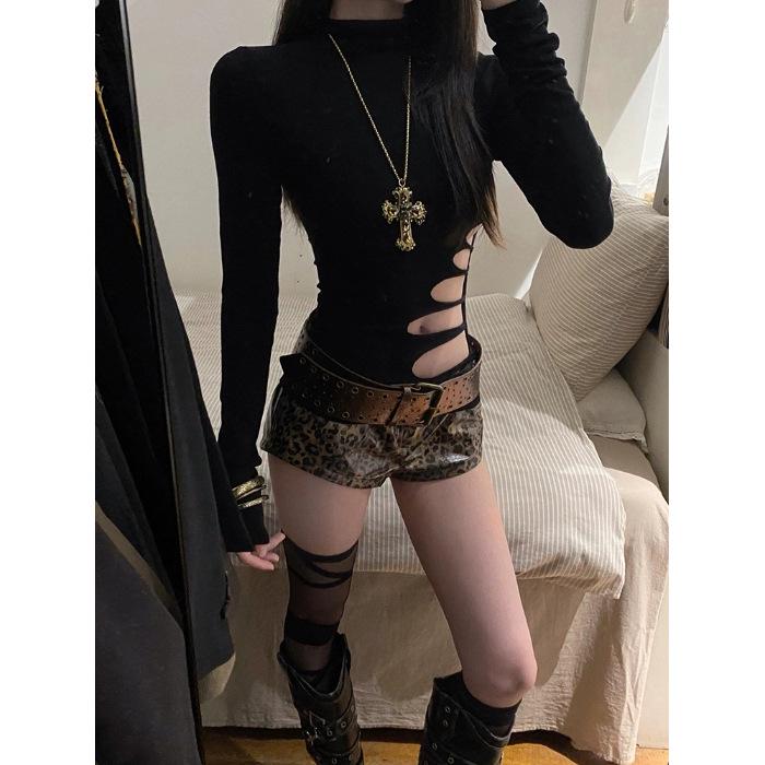 Women's Trendy Long-Sleeve T-Shirt, Autumn '25, Ripped Hollow-Out, American Retro, Slimming Fit