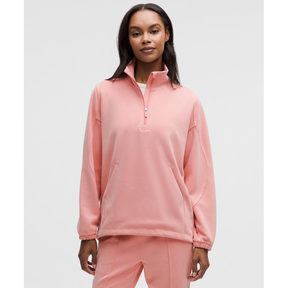 Transition from workout class to coffee shop in comfort. This oversized half zip is a little longer in the back for coverage and has a cinchable hem to adjust the look and length.