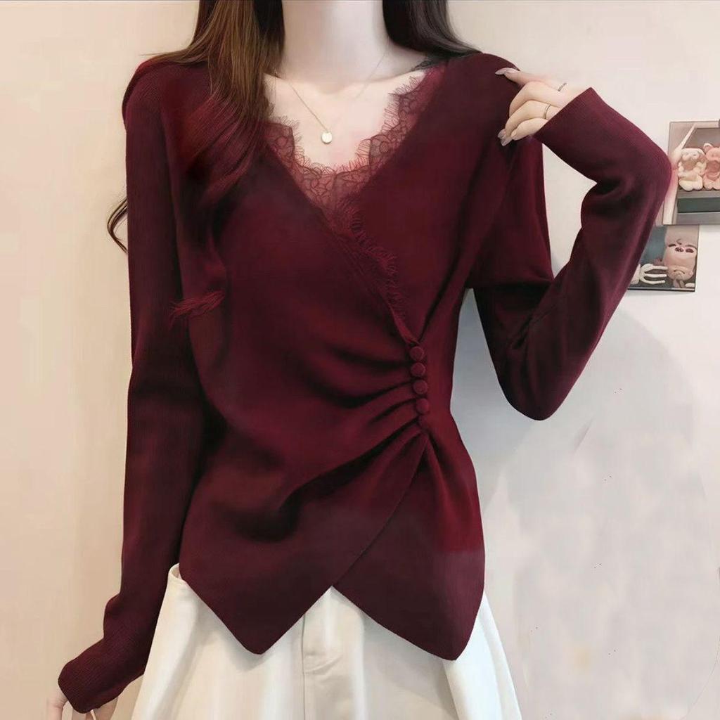 Discover elegance and comfort with this beautifully crafted women's shirt, designed for the cooler seasons of autumn and winter. Made with premium velvet, this top offers a slimming silhouette while maintaining a sophisticated look with its exquisite French lace detailing. The v-neckline adds a touch of allure, and the irregular hem creates a modern, stylish edge. Featuring long sleeves for added warmth and a flat cloth material that feels soft against the skin, this base layer shirt is perfect for layering or wearing on its own for a chic, flattering ensemble.