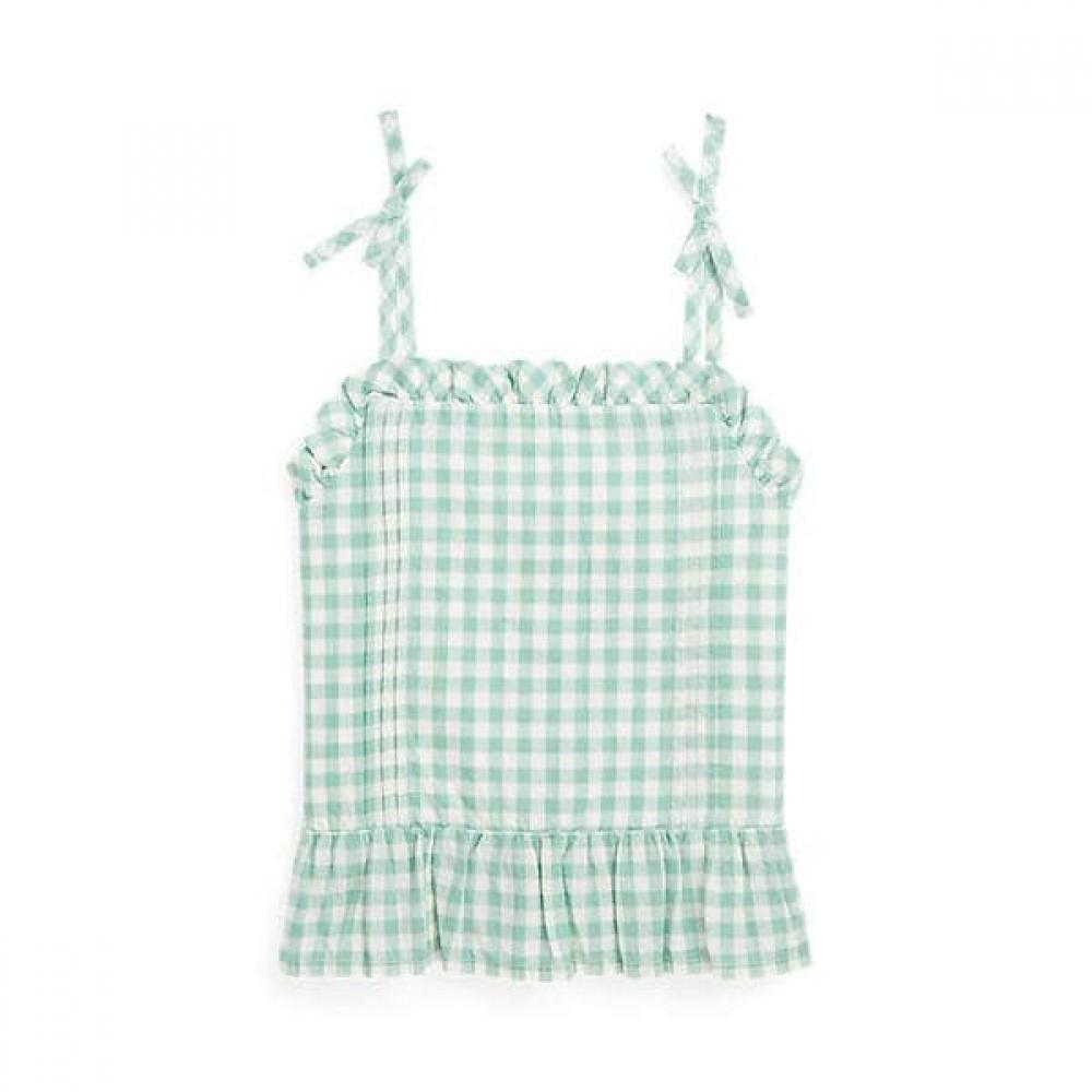 This is a gingham cotton madras top for girls aged 2-6 from Polo Kids, featuring ribbon details and ruffled trims on the shoulders. Made from lightweight cotton madras fabric, it provides a stylish look for warm weather. It has the signature pony embroidery at the right hem, a straight neckline, button placket at the back, pre-tied bows on both shoulders, pintuck details along the front body, and flounced hem along with body lining.