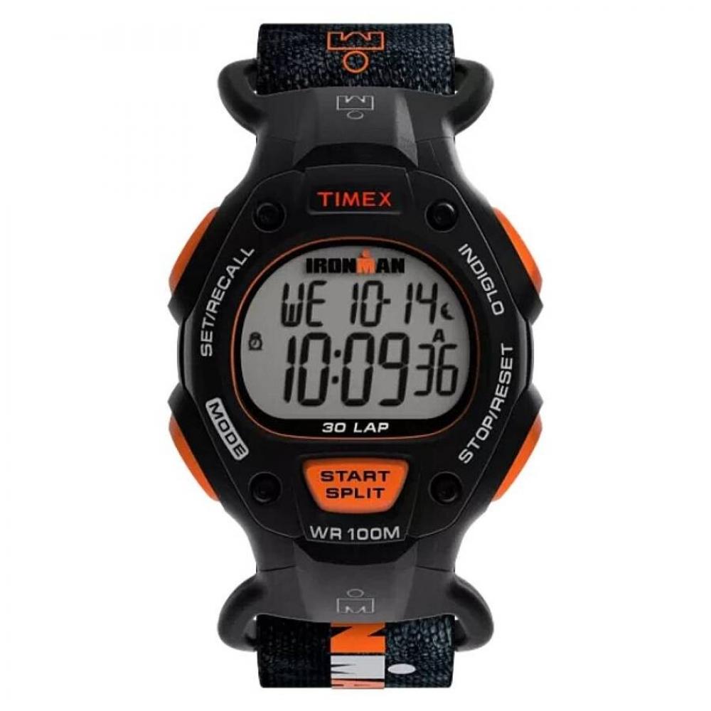 Black resin case with a black fabric strap. Fixed black resin bezel. Digital dial. Dial Type: digital. Quartz movement. Scratch resistant acrylic crystal. Solid case back. Round case shape, case size: 38 mm, case thickness: 11 mm. Band width: 22 mm. Buckle clasp. Water resistant at 100 meters / 330 feet. Functions: date, day, hour, minute, second, 3 time zone tracking capability, 24-hour countdown timer, alarm. Ironman Series. Sport watch style. Timex Ironman Classic 30-Lap Quartz Digital Watch TW2W94000.