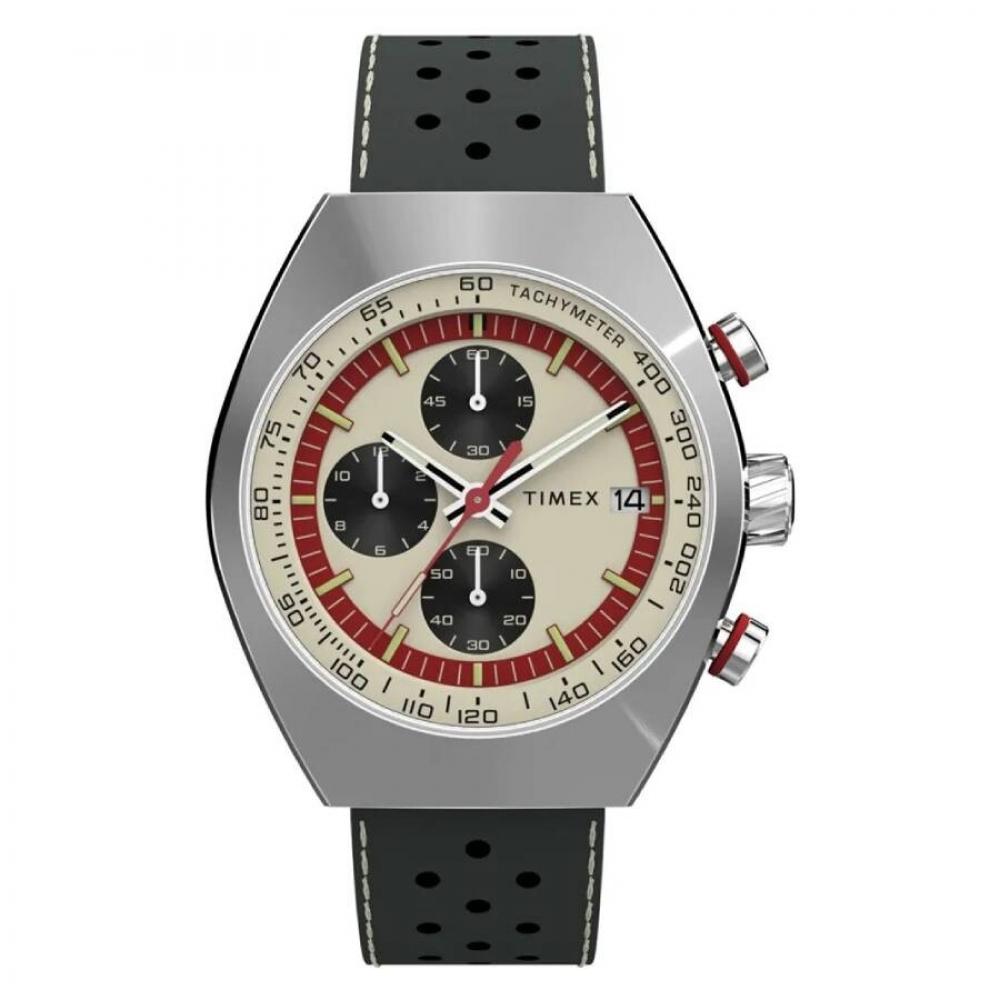 Silver-tone stainless steel case with a leather strap. Fixed silver-tone stainless steel bezel. Beige dial with silver-tone hands and index hour markers. Minute markers around the outer rim. Dial Type: Analog. Date display at the 3 o'clock position. Chronograph - three sub-dials displaying: 60 second, 60 minute and 12 hour. Quartz movement. Scratch resistant mineral crystal. Pull / push crown. Solid case back. Tonneau case shape, case size: 42 mm, case thickness: 11 mm. Band width: 22 mm. Buckle clasp. Water resistant at 50 meters / 165 feet. Functions: chronograph, date, hour, minute, second. Legacy Series. Sport watch style. Item Variations: TW2W93400VQ. Timex Legacy Chronograph Quartz Men's Watch TW2W93400.