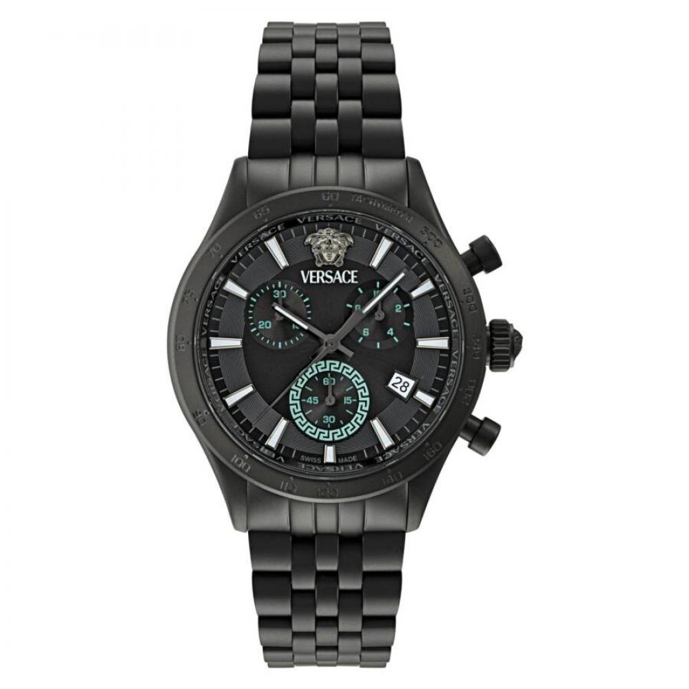 The "Versace Hellenyium Chronograph Quartz Black Dial Watch VECFA0624" features a black IP stainless steel case and bracelet. Equipped with a fixed tachymeter scale black IP stainless steel bezel, the black dial is adorned with black hands and index hour markers. It has an analog dial type along with luminescent hands and markers. The date display is positioned at the 4 o'clock marker, and the chronograph function comes with three sub-dials showing 60 seconds, 30 minutes, and 12 hours. Featuring a quartz movement, this watch is protected with a scratch-resistant sapphire crystal. The pull/push crown and solid case back give it a round case size of 40 mm. It has a deployment clasp with a push-button release and is water-resistant up to 50 meters/165 feet.