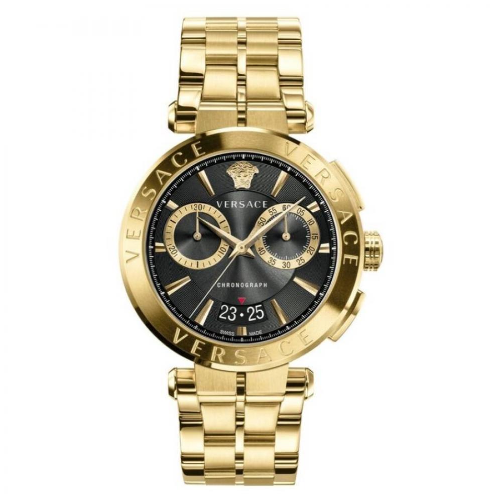 The watch features a gold-tone stainless steel case and bracelet, paired with a fixed gold-tone stainless steel bezel. The black dial showcases gold-tone hands and index hour markers with minute markers around the outer rim. This analog timepiece has a date display at the 6 o'clock position and offers chronograph functionality with two sub-dials for 60 seconds and 30 minutes. It operates on quartz movement, is protected by scratch-resistant sapphire crystal, and includes a pull/push crown and solid case back. The round case has a diameter of 45 mm and a thickness of 11 mm. The fold-over clasp is equipped with a safety release mechanism for enhanced security and the watch is water resistant up to 50 meters (165 feet). Functions include chronograph, date, hour, minute, and second. It belongs to the Aion Series and comes with a Swiss Made label.