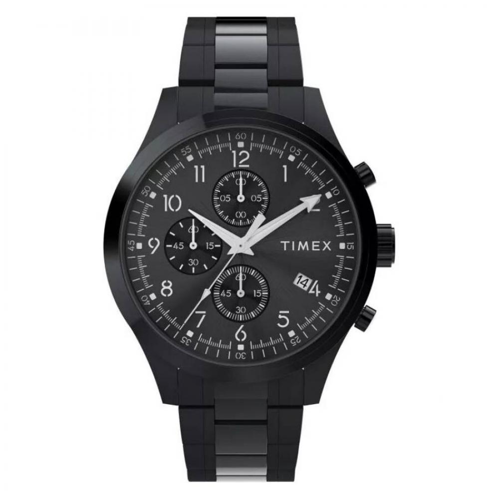 The Timex Trend Chronograph Quartz Black Dial Men's Watch TW2Y01600 features a black stainless steel case and bracelet, complemented by a fixed black stainless steel bezel. The analog black dial showcases silver-tone hands and Arabic numeral hour markers, with minute markers around the outer rim. A date display is positioned at the 4 o'clock mark, and it incorporates a chronograph function with three sub-dials that measure 60 seconds, 60 minutes, and 1/10th of a second. This watch is powered by quartz movement and is protected by a scratch-resistant mineral crystal.