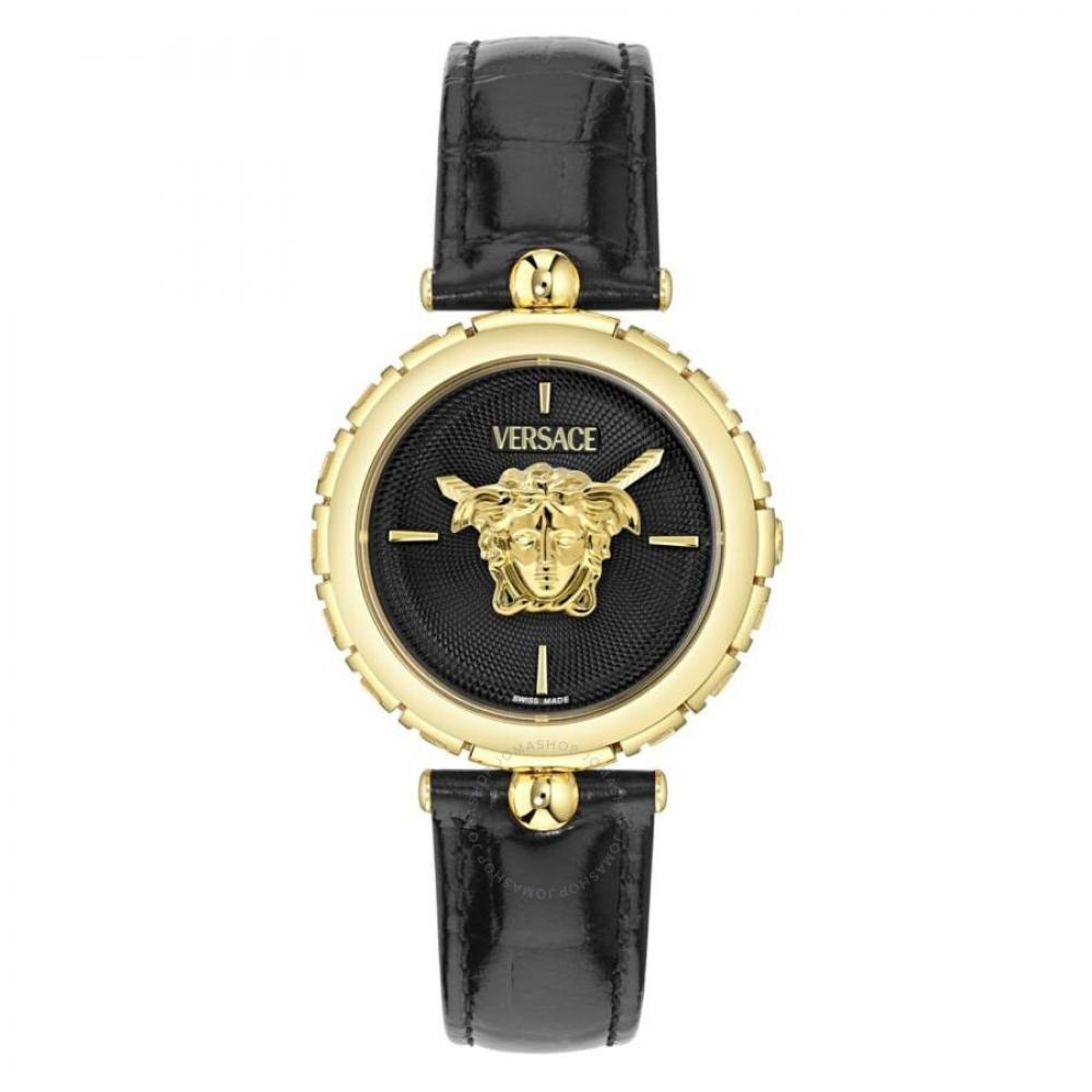 The Versace Medusa Heritage Quartz Black Dial Ladies Watch VE9D00124 showcases a refined design. It features a gold-tone stainless steel case paired with a black leather strap, complemented by a fixed gold-tone stainless steel bezel. The dial is black with gold-tone hands and index hour markers. It uses quartz movement with an analog type and scratch-resistant sapphire crystal for enhanced durability.