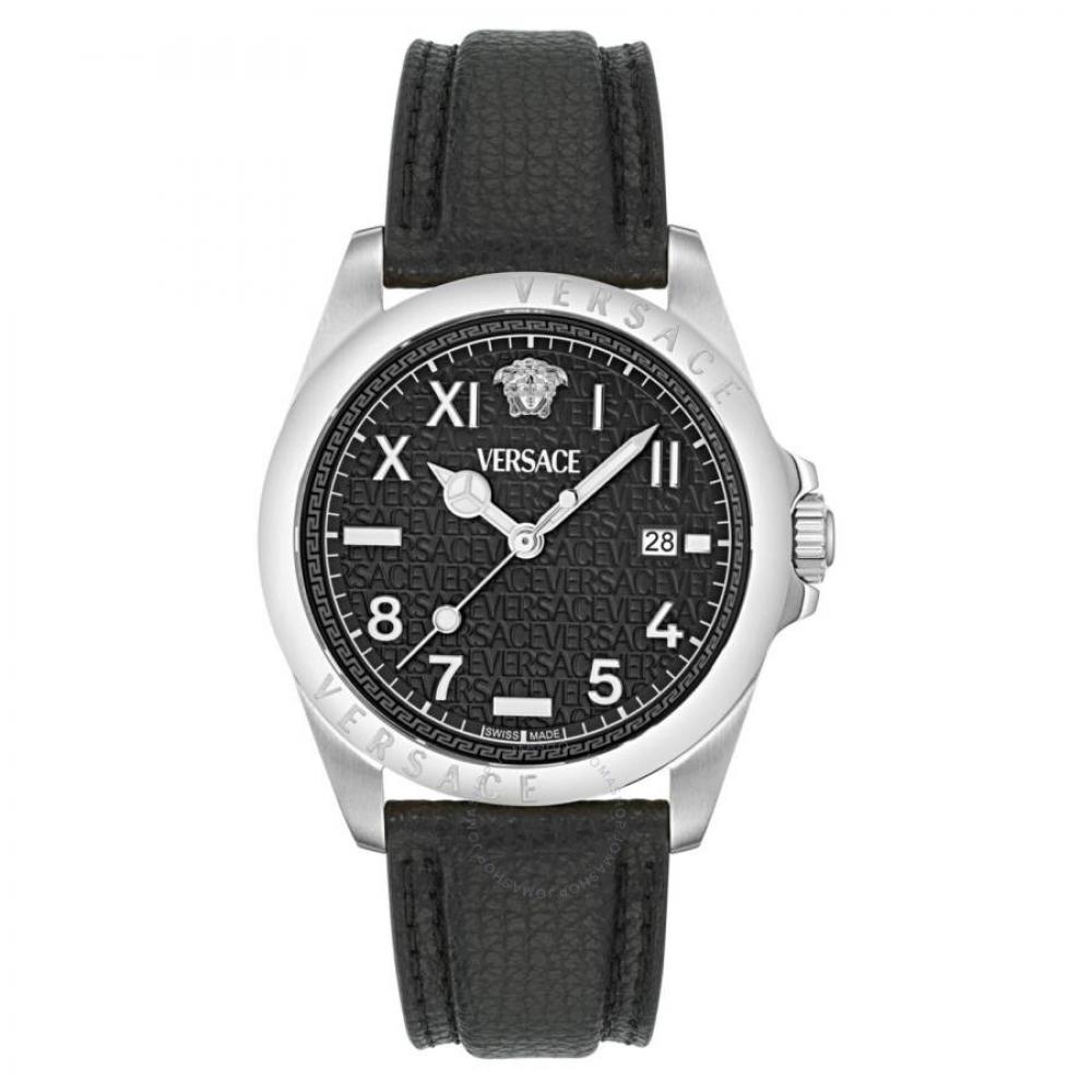 The Versace Anteo Quartz Black Dial Men's Watch (VE9H00124) features a silver-tone stainless steel case paired with a black leather strap. It showcases a fixed silver-tone stainless steel bezel, accented by a black dial with silver-tone hands and a combination of Arabic and Roman numeral hour markers. Minute markers are located around the outer rim, and the dial type is analog. Additionally, it features a date display at the 3 o'clock position, operates on quartz movement, and is protected by a scratch-resistant sapphire crystal. The watch includes a pull/push crown, a solid case back, and has a round case shape with a size of 41 mm. The buckle clasp ensures a secure fit, while its water resistance is rated up to 50 meters. Functions include date, hour, minute, and second for versatile use. Designed as a casual watch, it is labeled Swiss Made, showcasing excellent craftsmanship.
