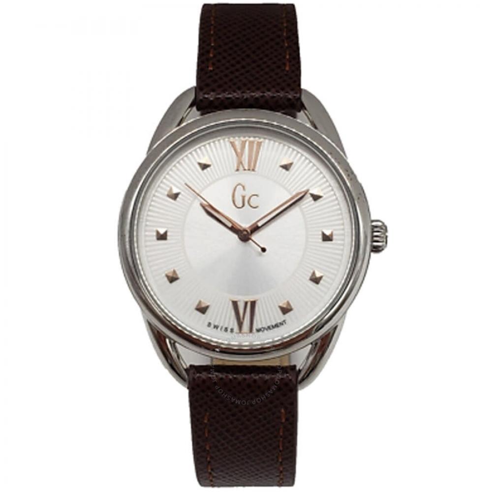 Stainless steel case, Leather strap, White dial, Quartz movement, Scratch resistant sapphire, Water resistant up to 5 ATM - 50 meters - 165 feet Silver-tone stainless steel case with a brown leather strap. Fixed silver-tone stainless steel bezel. White dial with gold-tone hands and index hour markers. Dial Type: Analog. Quartz movement. Scratch resistant sapphire crystal. Round case shape, case size: 32 mm, case thickness: 8 mm. Band width: 14 mm, band length: 7.5 inches. Buckle clasp. Water resistant at 50 meters / 165 feet. Functions: hour, minute, second. Gc Brown Leather Series. Fashion watch style. Guess Gc Brown Leather Quartz White Dial Ladies Watch Y13006L1.
