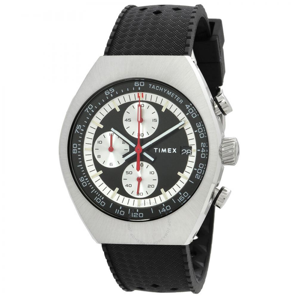 Silver-tone stainless steel case with a black synthetic rubber strap. Fixed silver-tone stainless steel bezel. Black dial with black hands and index hour markers. Minute markers around the outer rim. Dial Type: Analog. Date display at the 3 o'clock position. Chronograph - three sub-dials displaying: 60 second, 60 minute and 12 hour. Quartz movement. Scratch resistant mineral crystal. Pull / push crown. Solid case back. Tonneau case shape, case size: 42 mm, case thickness: 11 mm. Band width: 22 mm. Buckle clasp. Water resistant at 50 meters / 165 feet. Functions: chronograph, date, hour, minute, second. Legacy Series. Sport watch style. Item Variations: TW2W64500VQ. Timex Legacy Chronograph Quartz Black Dial Men's Watch TW2W64500.