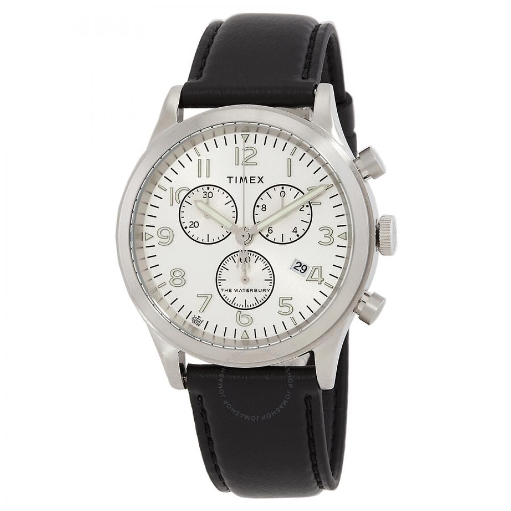 Silver-tone stainless steel case with a black leather strap. Fixed silver-tone stainless steel bezel. Silver dial with silver-tone hands and Arabic numeral hour markers. Minute markers around the outer rim. Dial Type: Analog. Luminescent hands and markers. Date display at the 4 o'clock position. Chronograph - three sub-dials displaying: 60 second, 30 minute and 1/10th of a second. Quartz movement. Scratch resistant mineral crystal. Solid case back. Round case shape, case size: 42 mm, case thickness: 11.5 mm. Band width: 22 mm. Buckle clasp. Water resistant at 100 meters / 330 feet. Functions: chronograph, date, hour, minute, second. Waterbury Series. Sport watch style. Watch label: Japan Movt. Item Variations: TW2W48100VQ. Timex Waterbury Traditional Chronograph Quartz Silver Dial Men's Watch TW2W48100.