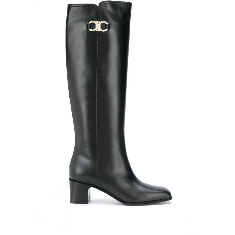 The Salvatore Ferragamo Gancini knee-high boots are crafted in black leather, featuring a stylish square toe. The mid-block heel provides a comfortable wear experience.
