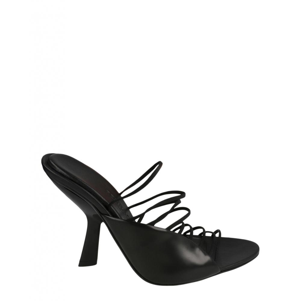 Slides on, Strappy vamp, Almond toe, Curved heel, Smooth finish, Strappy design.