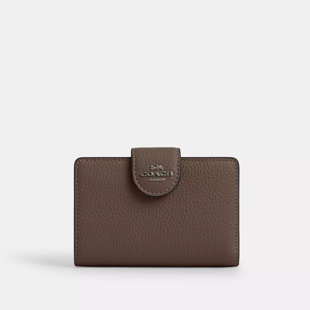 The Coach Medium Corner Zip Wallet in Dark Stone is crafted from refined pebble leather. This wallet features seven credit card slots, a bill compartment, an ID window, a snap closure, and a zip coin pocket, merging high functionality with elegant design.