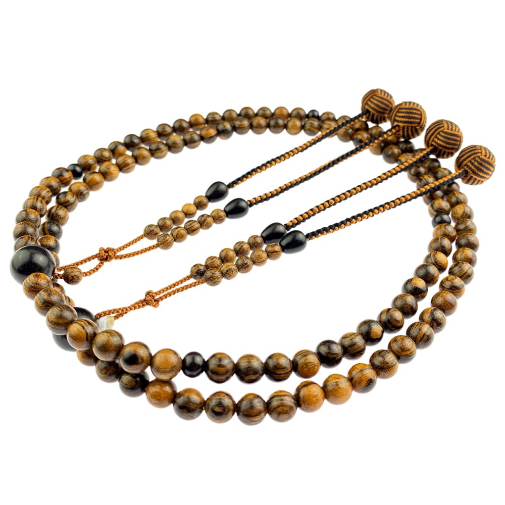 These are formal prayer beads for men of the Shingon sect. They are made from tiger skin sandalwood. Tiger skin sandalwood is called tiger skin sandalwood because it has a pattern resembling tiger skin. The wood has a clear grain, is hard, and has a delicate surface, making it an ideal material for making prayer beads. Ebony is used as an accent, resulting in a beautifully balanced set of prayer beads. The tassels are made from Odamaki Bonten tassels, which are durable, easy to handle, and do not lose their shape. They are lightweight and can be used for a long time.