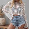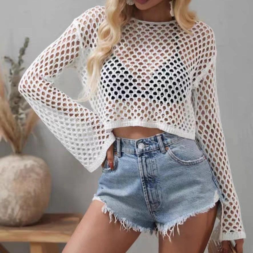 Summer New Knitted Sweater Horn Sleeves Loose Round Neck Hollow Sweater Women