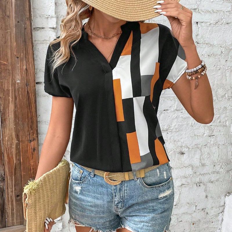 New Summer Women's Shirt V-neck Color-blocked Short-sleeved Casual and Comfortable Top