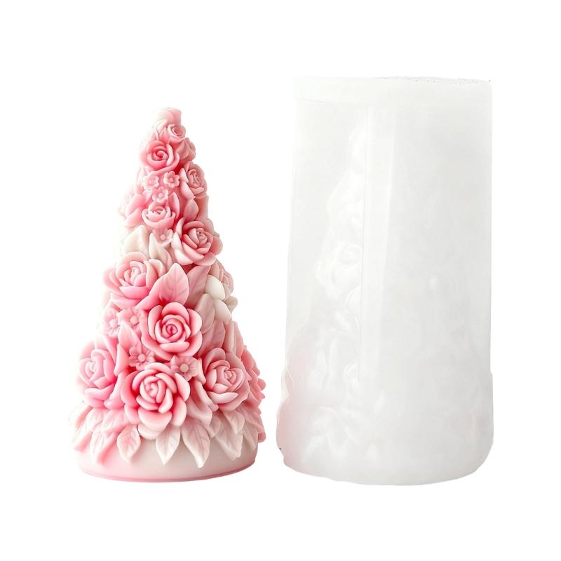 This rose Christmas tree silicone candle mold features intricate embossed rose flower detail, multipurpose functionality for crafting scented candle, decoration or epoxy resin, and dishwasher safe.