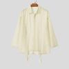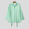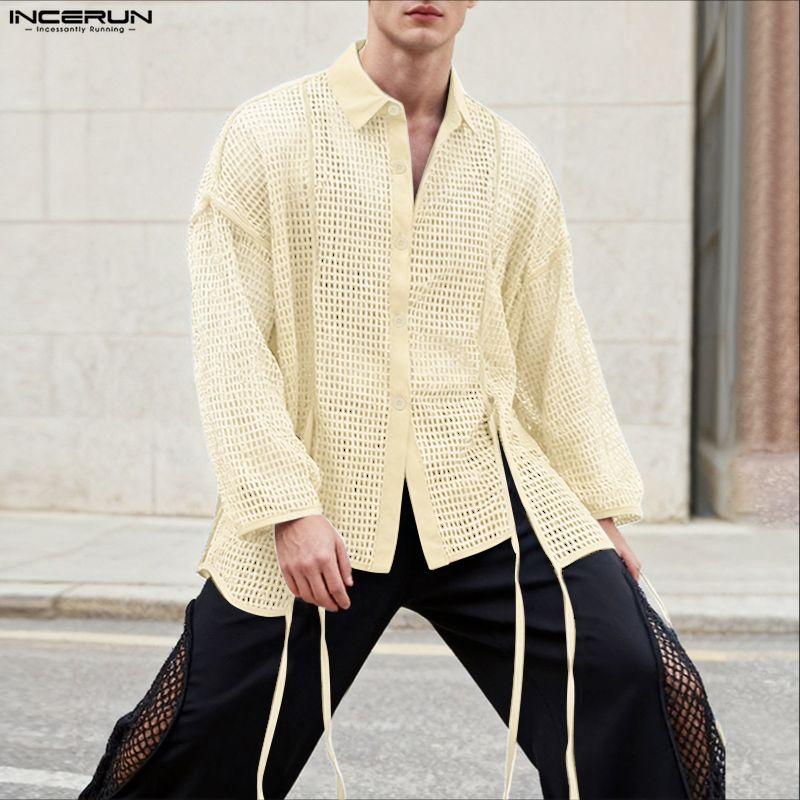INCERUN Men Lapel Neck Long Sleeve Hollow Out Fishnet Mesh Sheer Beach Shirts Tops