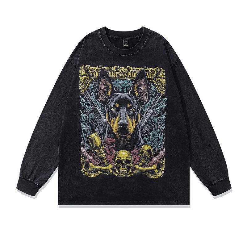 Washed And Polished Old Round Neck Pullover Sweater American High Street Doberman Print Retro Long-Sleeved T-Shirt Men