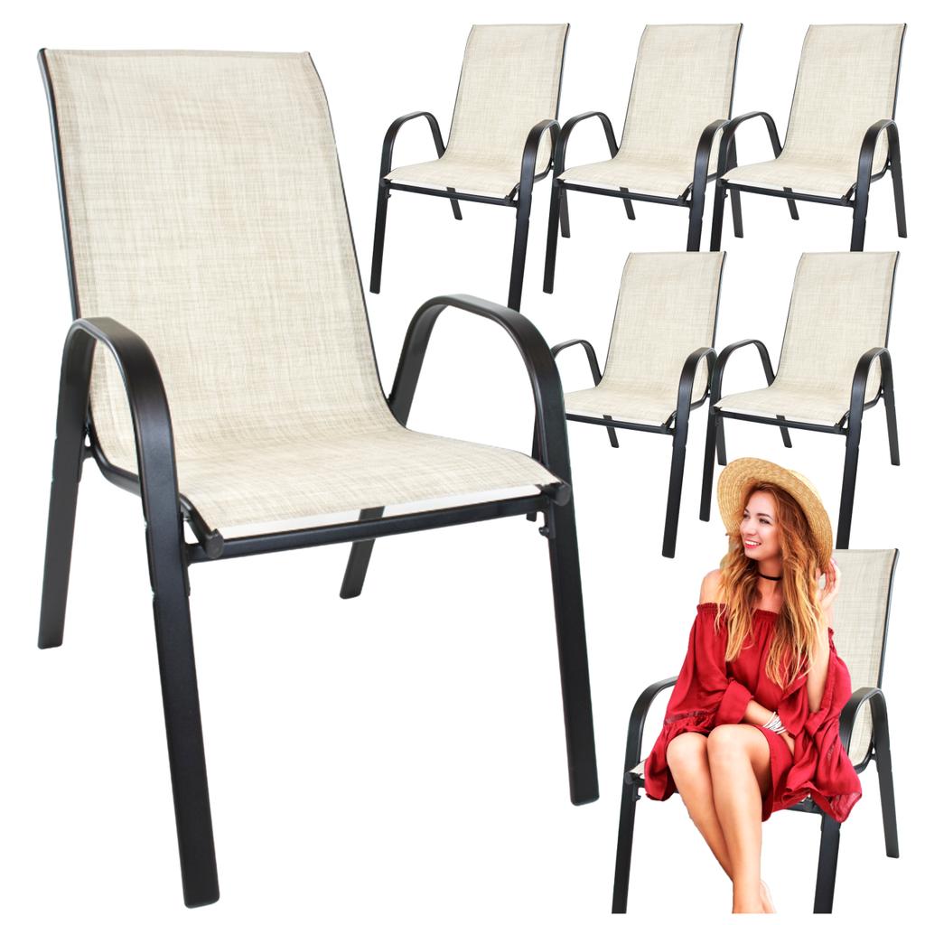 6x GARDEN CHAIR METAL ARMCHAIR BEIGE MODERN BALCONY TERRACE Are you dreaming of relaxing on the terrace, balcony or in the garden and are you looking for the perfect chair ? Do you want to invest in something specific - something that will serve you for many years ? We offer a comfortable metal chair that will be the perfect complement to your relaxation zone! A STYLISH CHAIR PERFECT FOR YOUR GARDEN! The modern design of the chair will look very good in your garden, add charm to it and will be the perfect complement to the arrangement. STABLE CONSTRUCTION The stable base and refined construction provide exceptional comfort, convenience and safety of use . The frame of the chair is made of high-quality powder-coated steel . Double powder paint coating makes the chair more resistant to weather conditions. COMFORTABLE SEAT The seat and backrest are made of flexible textile upholstery , which will provide you exceptional comfort even during prolonged sitting. The elasticity of the material means that the seat evenly distributes the body weight, eliminating pressure points and ensuring maximum comfort . COMFORT ON HOT DAYS The textile upholstery allows free air circulation , which is very important especially on warmer days. Thanks to this, sitting on the chair is pleasant , and you can enjoy coolness even on hot days. The fabric is resistant to weather conditions such as rain and UV rays, as well as moisture and dirt. EVERYTHING FOR YOUR COMFORT! The slightly reclined backrest provides natural support for the spine, which helps maintain correct posture while sitting. The armrests provide additional support for the arms, significantly increasing seating comfort. They allow the arms to position naturally, which reduces muscle strain and prevents discomfort. WITH ATTENTION TO DETAIL! The legs are additionally equipped with plastic covers, so that they do not scratch the surface on which they stand. Our garden chair is made of easy-to-clean materials , which allow for quick and effective removal of dirt. The chairs are stackable , meaning they can be stacked one on top of the other , saving space during storage or transport. SPECIFICATION 6 pieces in a set! Total height: 89 cm Total width: 55 cm Total depth: 80 cm (from end of backrest to front legs) Leg width at the side: 67 cm Leg width at the front: 47 cm Seat height: 37 cm at the back; 42 cm in front Seat width: 44 cm Seat depth: 43 cm Backrest height: 58 cm Backrest width: 44 cm Armrest height: 58 cm Armrest width: 4.5 cm Maximum load: approx. 120 kg Permissible measurement error +/- 2 cm. Self-assembly chairs – convenient and safe delivery! Our garden chairs are delivered for self-assembly. This allows us to guarantee their safe transport and compact packaging , which facilitates storage and carrying. Easy and quick assembly – clear instructions and a complete set of essential components make assembly simple and intuitive. Safe delivery – the furniture is carefully packaged, minimizing the risk of damage during transport. Thoughtful design – after assembly, the chairs are stable, solid, and ready to use. Everything you need is included – in just a few moments you can enjoy the comfort of your new chairs! Video instructions included. FAQ - Frequently Asked Questions What material is this chair made of? The chair is made of high-quality powder-coated steel , which gives it exceptional durability and resistance to damage. Powder coating is done twice , which further increases its resistance to weather conditions such as rain, moisture or UV radiation. Is the chair weather resistant? Yes, thanks to the double powder coating, the chair features increased resistance to weather conditions such as rain, wind, and sunlight. It's an ideal choice for a garden, terrace, or balcony. What are the dimensions of the chair? The chair has the following dimensions: Height : 89 cm Width : 55 cm Depth : 80 cm Thanks to these dimensions, it is comfortable to sit on, providing adequate spaciousness and comfort. Does the chair require any special maintenance? The chair does not require any complicated maintenance. To keep them in good condition, simply clean the fabric upholstery regularly and wipe the steel frame with a damp cloth. It's a good idea to store them in a dry place during the winter to ensure their longevity.
