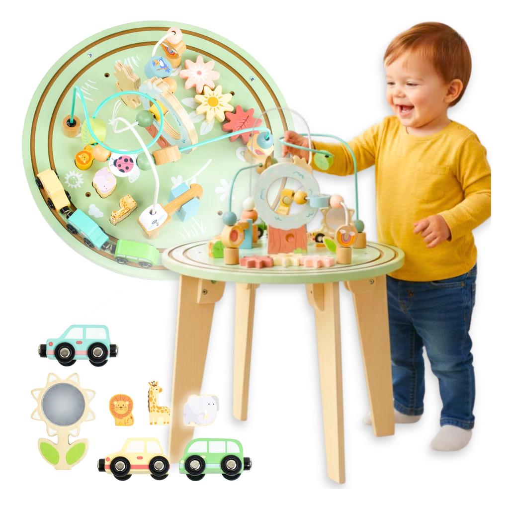 MONTESSORI WOODEN EDUCATIONAL TABLE PASTEL ALL ABOUT THE EDUCATIONAL TABLE: Educational toy in line with the Montessori method Intended for children from 2 years of age Motor loop with 2 tracks, shape sorter, colored gears, train with cars running around the table Colorful and visually attractive form of play Solidly made of wood Painted with non-toxic, safe paints Helps your child consolidate a standing position during play COGNITIVE DEVELOPMENT Logical thinking – tasks requiring matching (e.g., a sorter) teach your child to understand relationships and ordering. Cause and effect relationships – e.g., turning gears shows how one action affects another. Shape and Color Recognition – the sorter and colorful elements make it easier to learn the names and classification of objects. VISUAL-MOTOR COORDINATION Precision Movements – moving beads on motor loops and handling small elements require hand and visual control. Sensory Synchronization – various activities combine visual and motor stimuli, developing sensory integration. Shape and color recognition – the sorter and colorful elements make it easier to learn the names and classification of objects. FINE MOTOR SKILLS DEVELOPMENT Finger and hand dexterity – turning the wheels, moving the wagons, and throwing blocks into the sorter develops hand muscles and dexterity. Preparation for writing – regular fine motor exercises support later manual skills (e.g., holding a crayon). DEVELOPMENT OF GROSS MOTOR SKILLS AND POSTURE Playing in a standing position – supports the development of leg muscles and maintaining balance. Motor activity – moving around the table provides additional movement and physical activity. CREATIVITY AND IMAGINATION Free exploration – various functions allow your child to create their own play scenarios. Animal motifs and colors – stimulate the imagination and encourage storytelling. SPECIFICATION: Total dimensions: height 54 cm, diameter 40 cm Height to the tabletop: 32 cm Flower with mirror: 9x6x1 cm; Cars: 7.5x3x2 cm; Animals: 4x2x3 cm Recommended child age: 12 m + Toy elements: round wooden table, 2 colored motor loops with beads, launcher, shape sorter (triangle, square, circle), mirror, 3 gears, magnetic train with toy car-shaped carriages - the tracks are placed on the edge of the table Compatible with the Montessori method Non-toxic, safe paints CE, EN 71 safety certificate Frequently asked questions (FAQ) What age can this table be used from? This model is recommended from 2 years. Is the toy safe for small children? Yes, the product meets European safety standards (CE, EN71), does not contain sharp edges and is covered with non-toxic paints. Are the elements attached to the table? Yes, all activity elements (loops, train, gears) are integrated into the table, which prevents them from being lost. What skills does this toy develop? The table supports the development of fine motor skills, logical thinking, coordination, creativity, and recognition of shapes and colors.