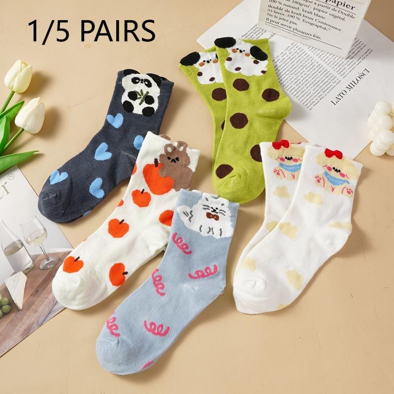 1/5 Pairs Women's Cute Cartoon Mid Calf Socks Pure Sotton Skin-friendly Breathable Mid-tube Socks Suitable for All Seasons
