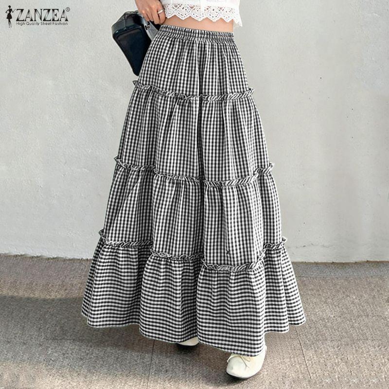 ZANZEA Women Casual Elastic Waist Loose Plaid Print Long Skirts