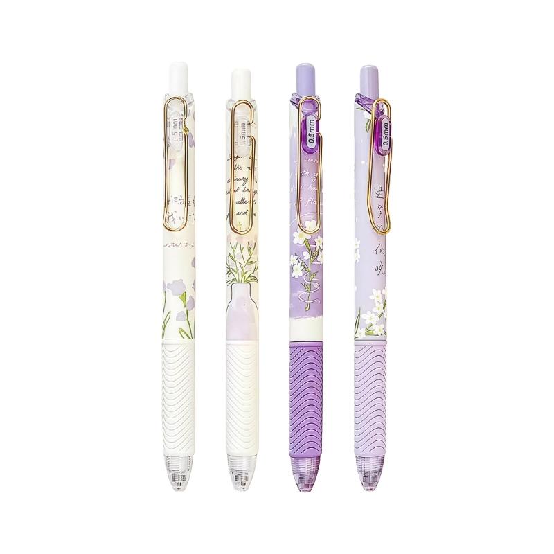 4PCS Flower Print Gel Inks Pen Retractable Gel Pen with Metal Clip Ergonomic Grip 0.5MM Tip Black Inks for Office School