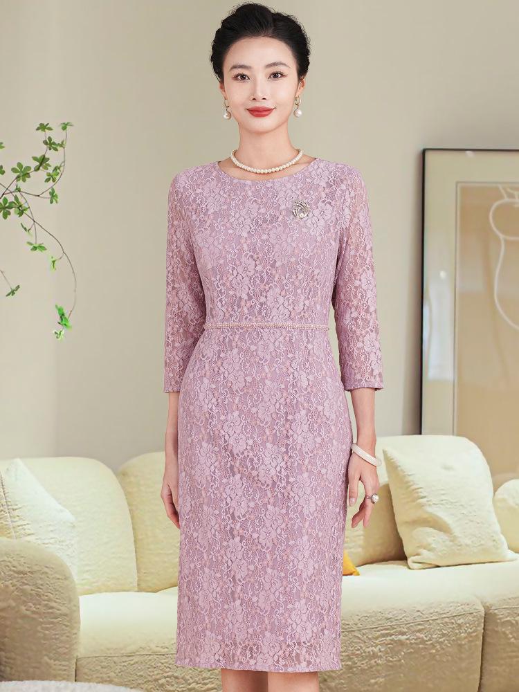 This elegant formal dress is the perfect choice for spring occasions, designed with a sophisticated Mother-of-the-Bride in mind. Crafted from high-quality lace material, it features delicate lace detailing that adds a touch of luxury and refinement. The dress boasts a classic round neckline and stylish three-quarter sleeves, providing a flattering silhouette. Available in plus sizes, this dress ensures both comfort and elegance for any special day.