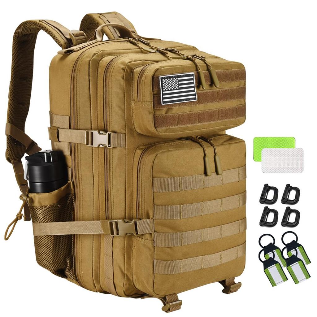 The tactical backpack is reinforced with 900D polyester fabric and double-stitched at all stress points. It has two main compartments, two smaller compartments at the front, and a compartment for a hydration bladder at the back (the backpack does not come with a hydration bladder). Each compartment has various pockets to help with organization.