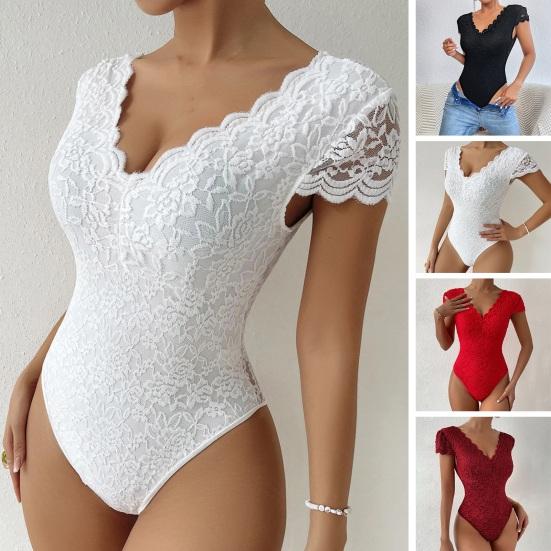 Women Bodysuit Solid Color Deep V-neck Lace Slim Fit Flower Embroidery Dress-up Sleeveless See-through Summer Playsuit Female Clothes