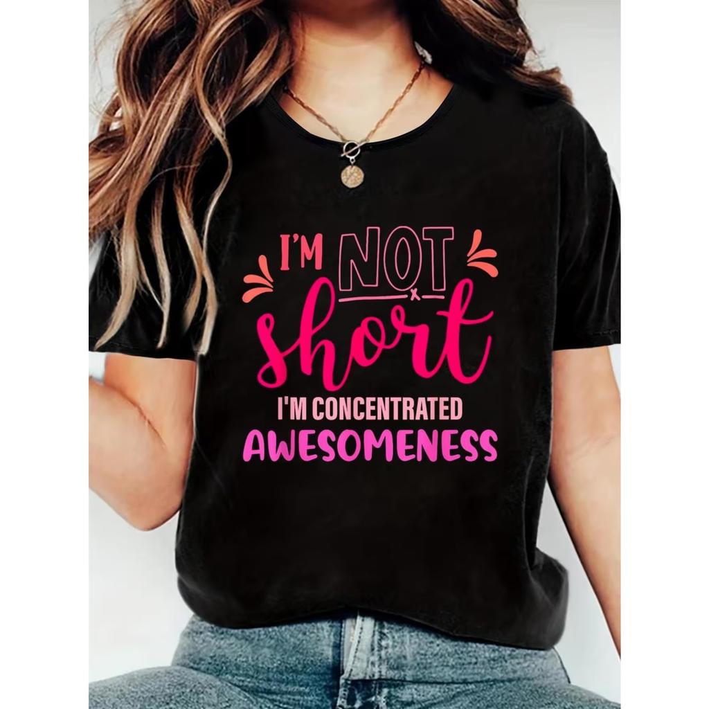 Women'S Graphic Tee That Says 'I'M Not Short, I'M Concentrated Awesomeness' - Features Black Fabric with Pink and Orange Text, Casual Wear