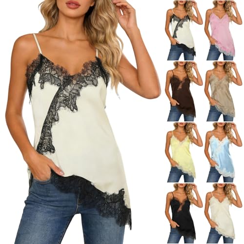 Women Fashion V Neck Satin Lace Camisole Adjustable Spaghetti Straps Sexy Cami Top