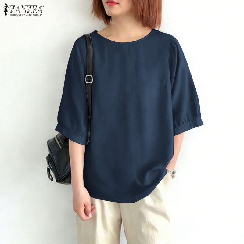 ZANZEA Women Casual Crew Neck Solid Color Loose Half Sleeve Blouse