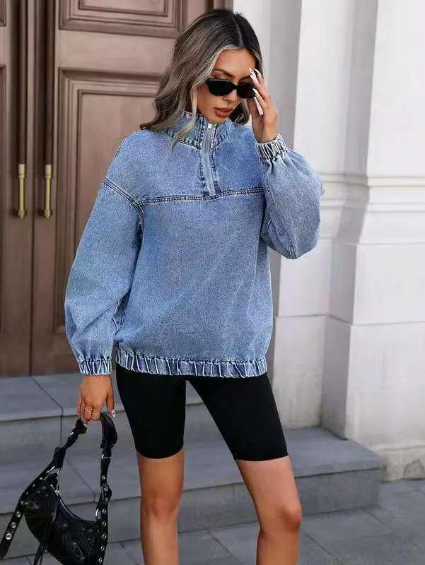Women's Washed Loose Round Neck Denim Jacket with Zipper – 2025 Autumn European and American Fashion Style