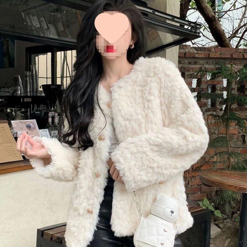 2025 Autumn/Winter Women's Petite Loose Lambswool Coat - Small Fragrance Style, Thickened Fur, Top Cotton Fabric.
