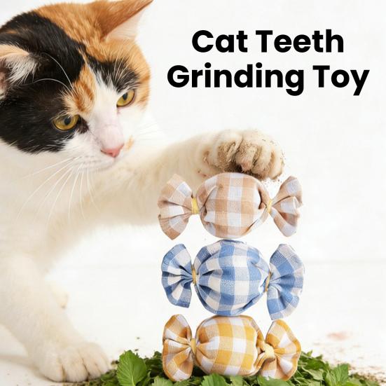 Candy shape cat toy combines durability and fun with high-quality plush and plaid fabric that resists bites and scratches, helping cats grind and clean their teeth for better oral health. Its charming candy-inspired design and vibrant colors make it an attractive home accessory while providing engaging play.