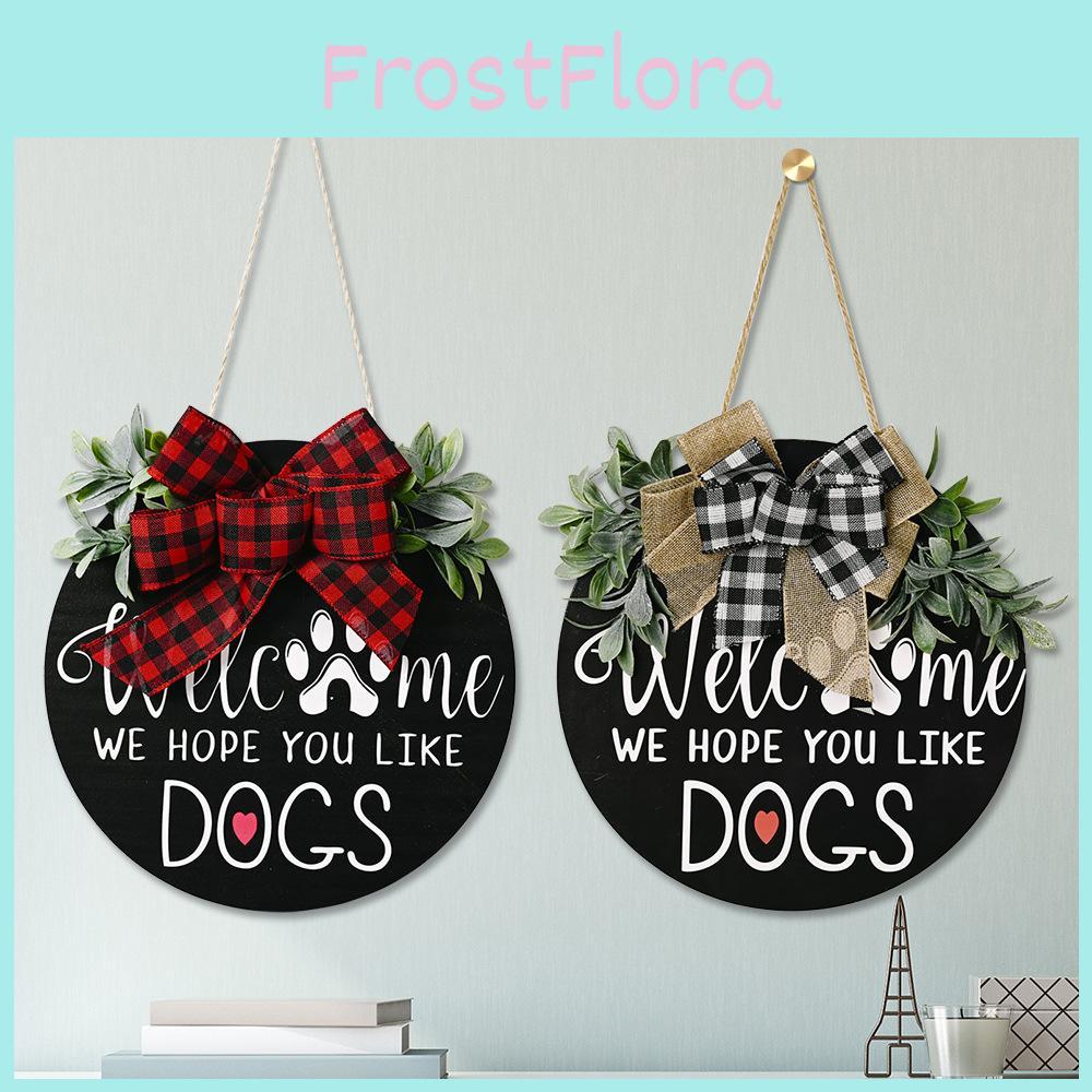 Charming Rustic Wooden Dog Sign With Delightful Bow And Leafy Wreath For Home Decor
