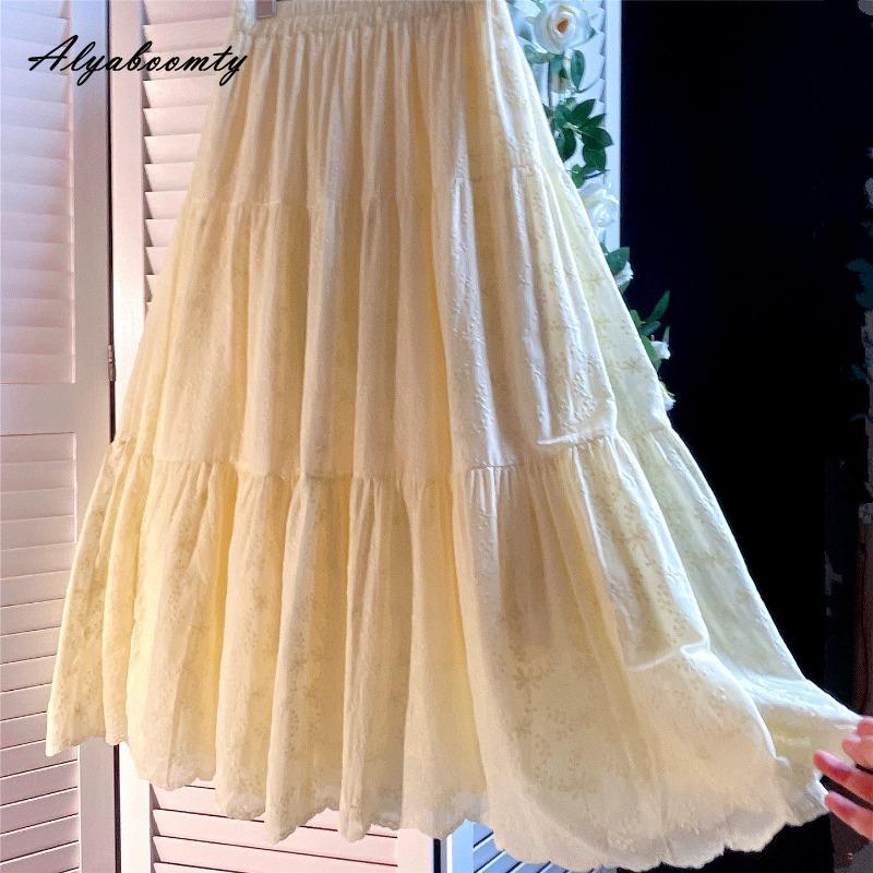 Japanese Mori Girl Spring Summer Women Sweet Skirt High Waist Light Yellow Embroidery Floral Skirt Soft Cotton Elegant Ladies' Skirt