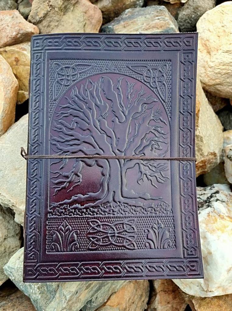 DESIGN & EMBOSSED :- Embossed Tree Of Life with celtic borders at front and hand tooled designs at back with cord.