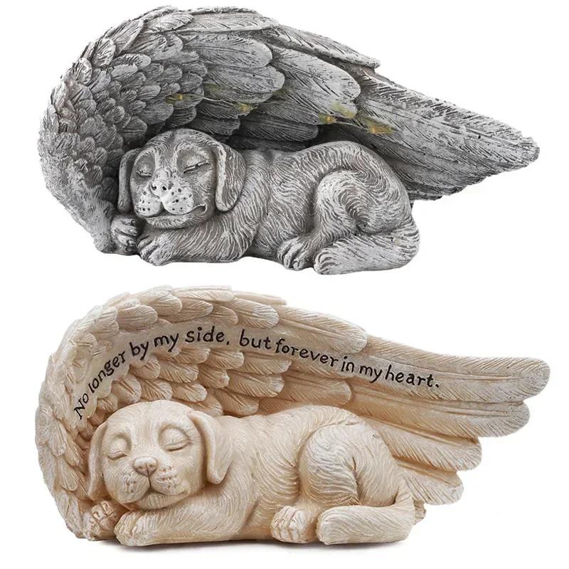 Resin Angel Dog Cat Statue Garden Decor Puppy Tombstone Sculpture Angel Wings LED Lights Garden Home Statues Figurine Gifts